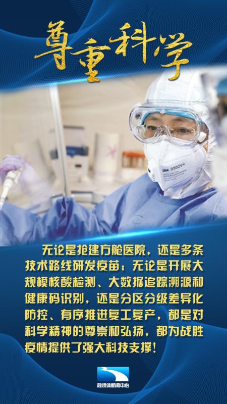 面对前所未知的新型传染性疾病,我们秉持科学精神、科学态度,把遵循科学规律贯穿到决策指挥、病患治疗、技术攻关、社会治理各方面全过程。在没有特效药的情况下,实行中西医结合,先后推出八版全国新冠肺炎诊疗方案,筛选出“三药三方”等临床有效的中药西药和治疗办法,被多个国家借鉴和使用。无论是抢建方舱医院,还是多条技术路线研发疫苗;无论是开展大规模核酸检测、大数据追踪溯源和健康码识别,还是分区分级差异化防控、有序推进复工复产,都是对科学精神的尊崇和弘扬,都为战胜疫情提供了强大科技支撑!